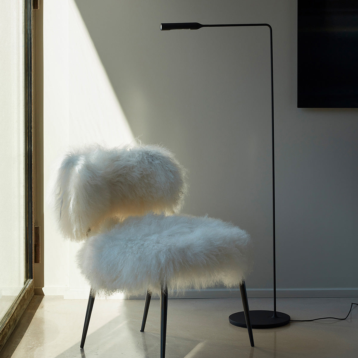 The Flo floor lamp is a simple and stylish design with defining characteristics. Flo fits beautifully in every interior, and is also often used in public places such as lounge areas (as in the Kulm Eispavillon in St. Moritz, for example), airports, waiting rooms and hotel halls. The head of the lamp is adjustable through 300° and the arm rotating 120° over the base.