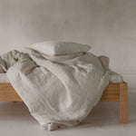 By Mölle's Sea Shell linen duvet cover, crafted from 100% pre-washed European flax linen, features a soft beige and off-white chambray weave. This breathable and hypoallergenic fabric offers comfort year-round and is available with either wooden buttons or a tuck-in flap closure. Handmade in the Netherlands with respect for the earth.