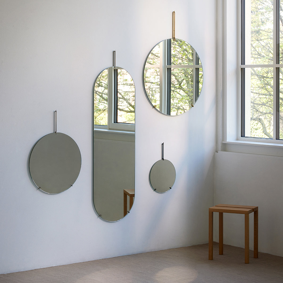 This beautiful tall wall mirror is a frameless mirror only held by a lightweight wire form. It was designed by Mobe by stripping it down to its essential elements. This way the mirror was kept simple, leaving the core function - the glass - to speak for itself.