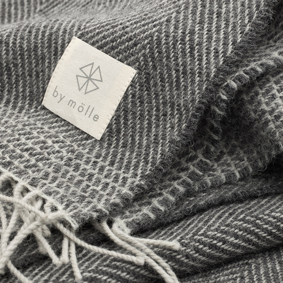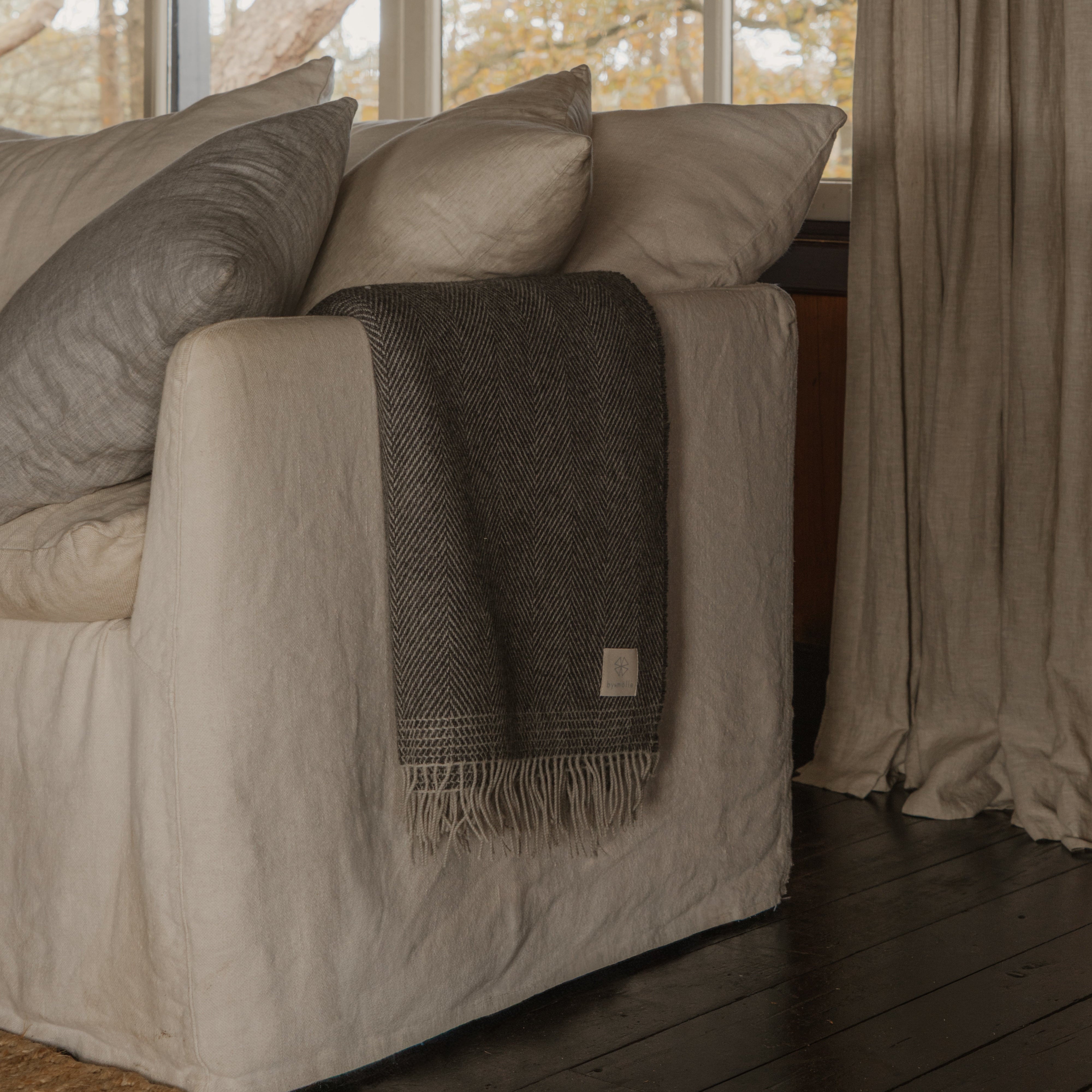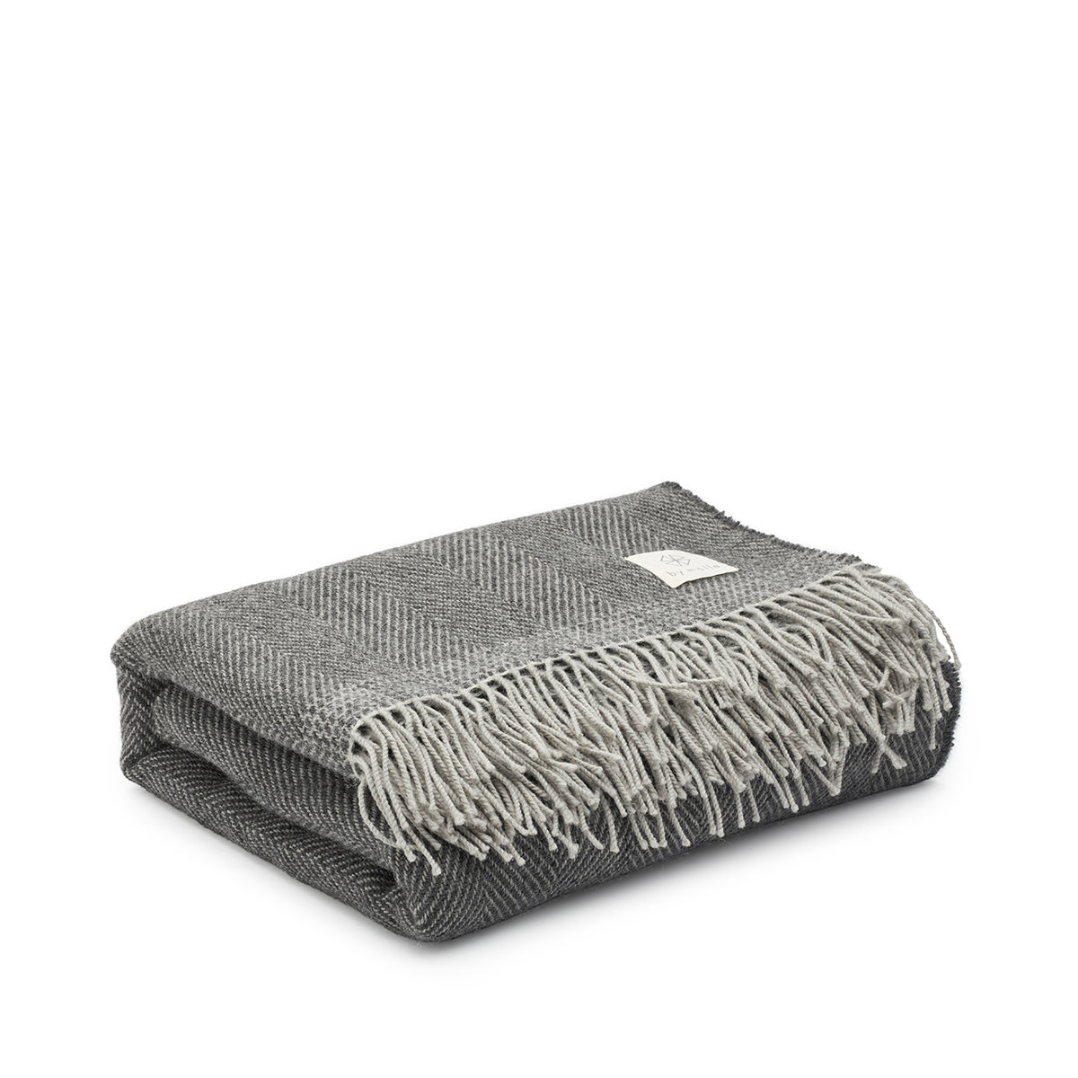 These heavy, warm throws are woven for us for us by a family run company in Ireland with 100% merino wool. Wrap it around you, use it as a warm throw, or add is as an extra layer on your bed. This throw is woven with a mix of light and dark grey yarn with dark grey fringes.