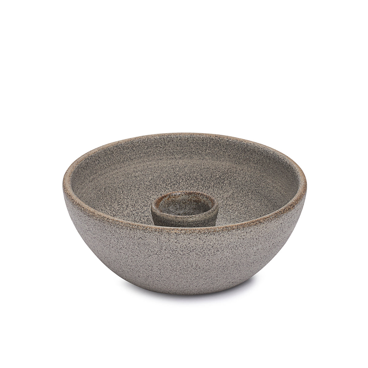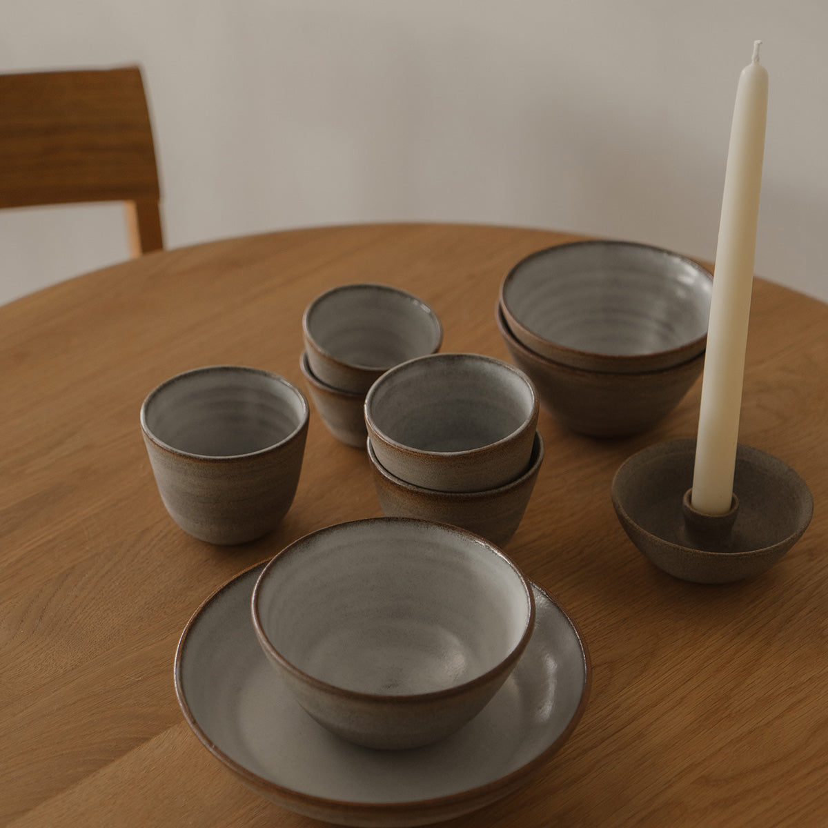 Handgedraaide keramieken kandelaar in matte grijstinten, met subtiele textuur en ronde, minimale vorm