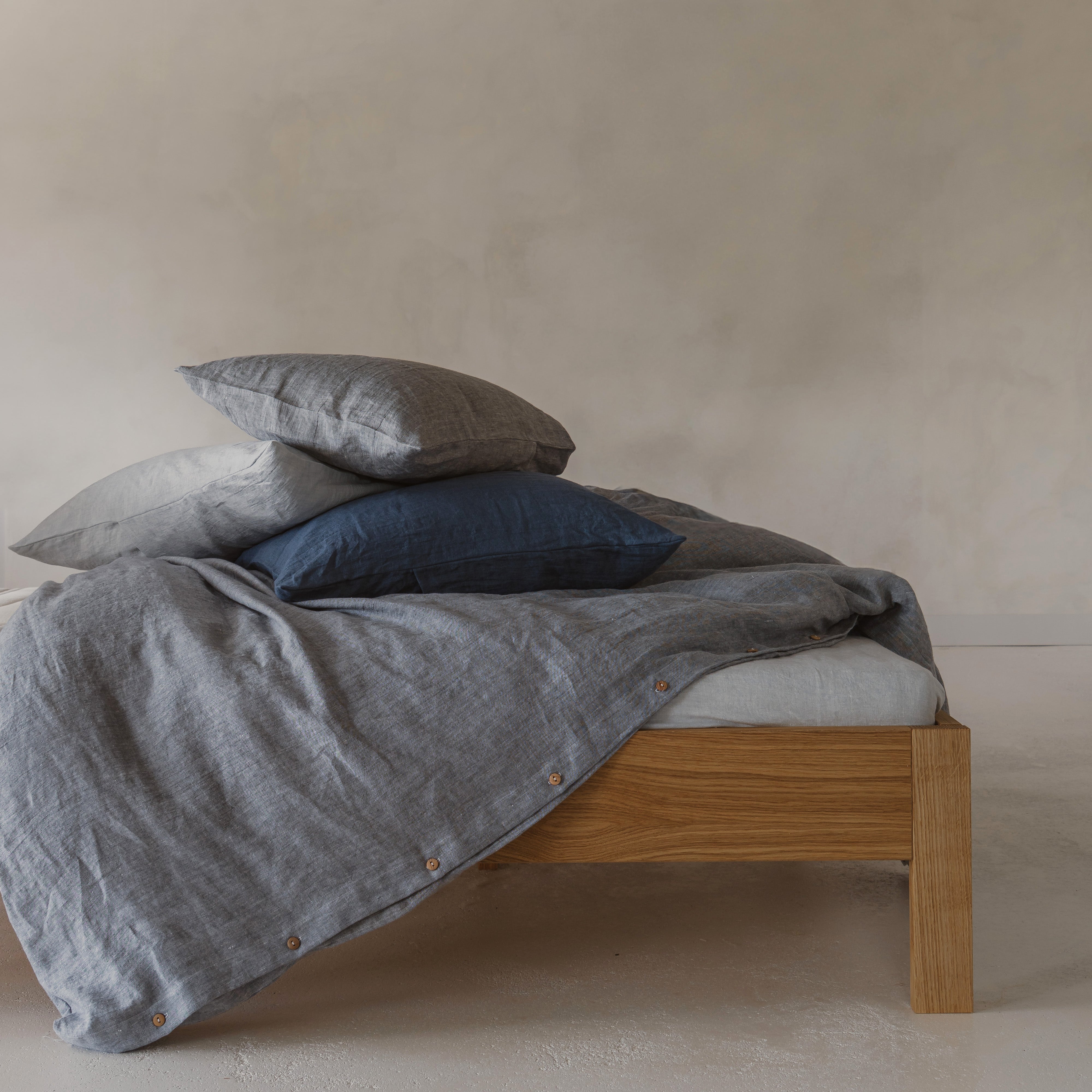 By Mölle's Cloudy Blue linen, crafted from 100% pre-washed European flax linen, features a chambray weave combining faded blue and off-white yarns. This breathable and hypoallergenic fabric offers comfort year-round. Handmade in the Netherlands with respect for the earth.