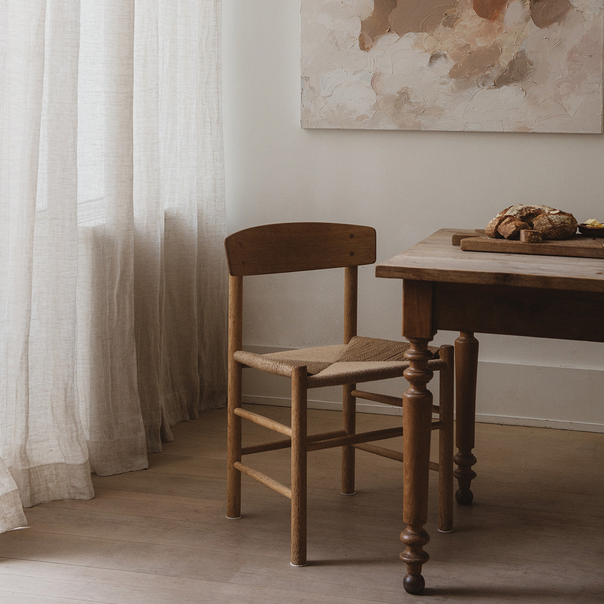 De iets dunnere linnen stof die we voor onze in between gordijnen gebruiken wordt voor ons geweven in Italië. De linnen stof filtert het licht heel mooi en is zacht en soepel. Met een breedte van 320 cm kunnen we deze gordijnen vaak zonder naden maken. Verkrijgbaar in zes natuurlijke, zachte tinten.