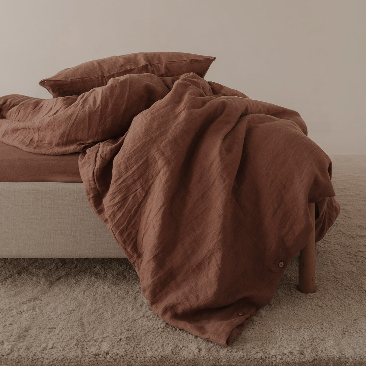 By Mölle's Terra linen duvet cover, crafted from 100% pre-washed European flax linen, features a deep, warm shade that pairs beautifully with blush and pink salt tones. The breathable and hypoallergenic fabric offers year-round comfort and is available with either wooden buttons or a tuck-in flap closure.