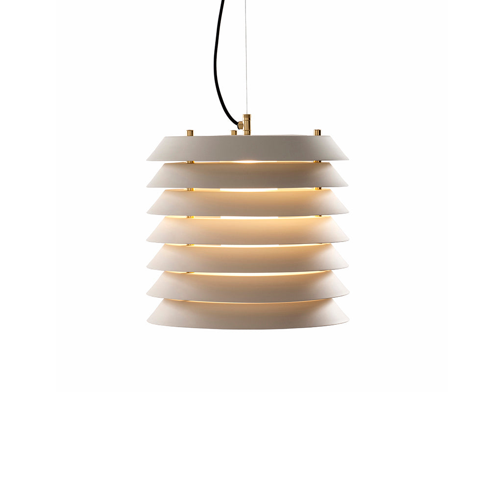The Maija collection is an expression of the feeling of light that is common in the cities of the Baltic: outwards. Tapiovaara conceived a column of small metal superimposed discs from which the light hangs out from a shimmering panel, shrouded in life. The tripod on which the structure rests and the recesses that allow the light to disperse upwards are particularly striking. The discs were originally in a light nude rose colour, subsequently white was produced and nowadays Santa & Cole offers both alternatives.